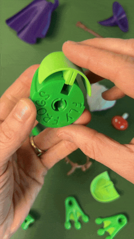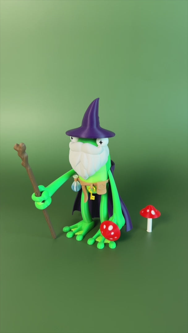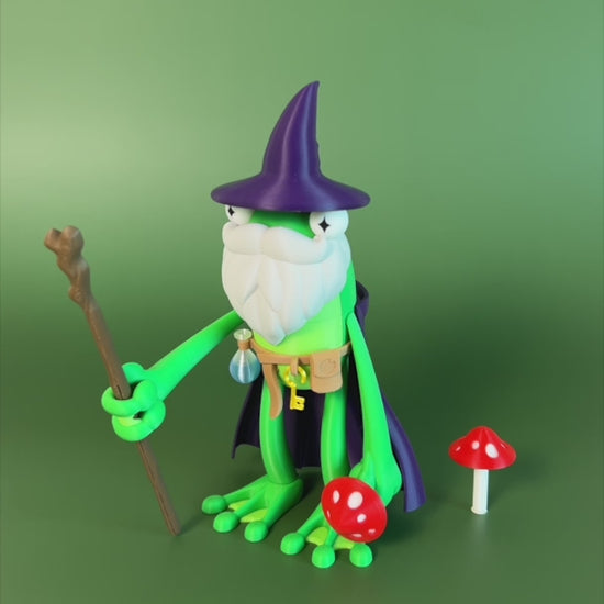 Fly Frog the Green! 🧙🐸 This wizard includes hat, cape, beard, staff, mushroom, and belt to hold his potion and key. All Fly Frog accessories are modular and interchangeable. Collect them all!